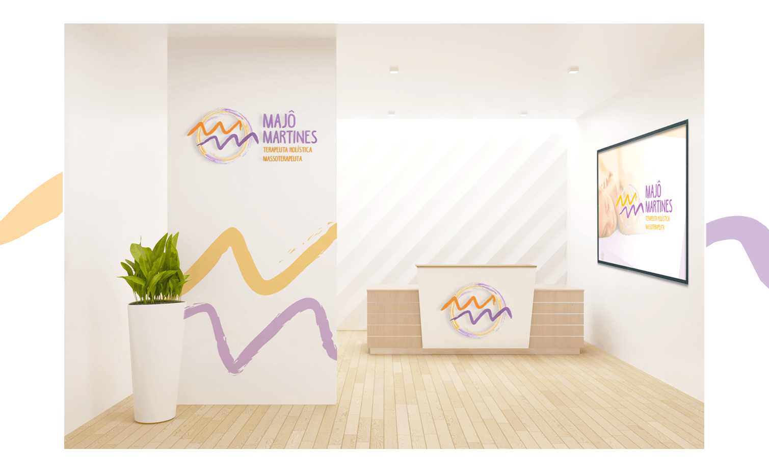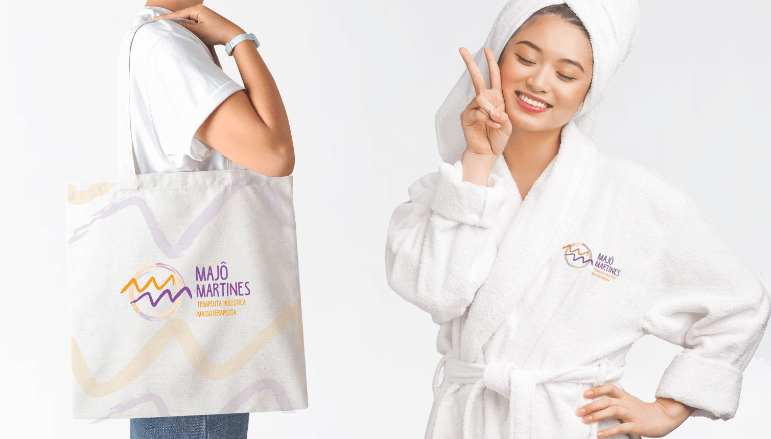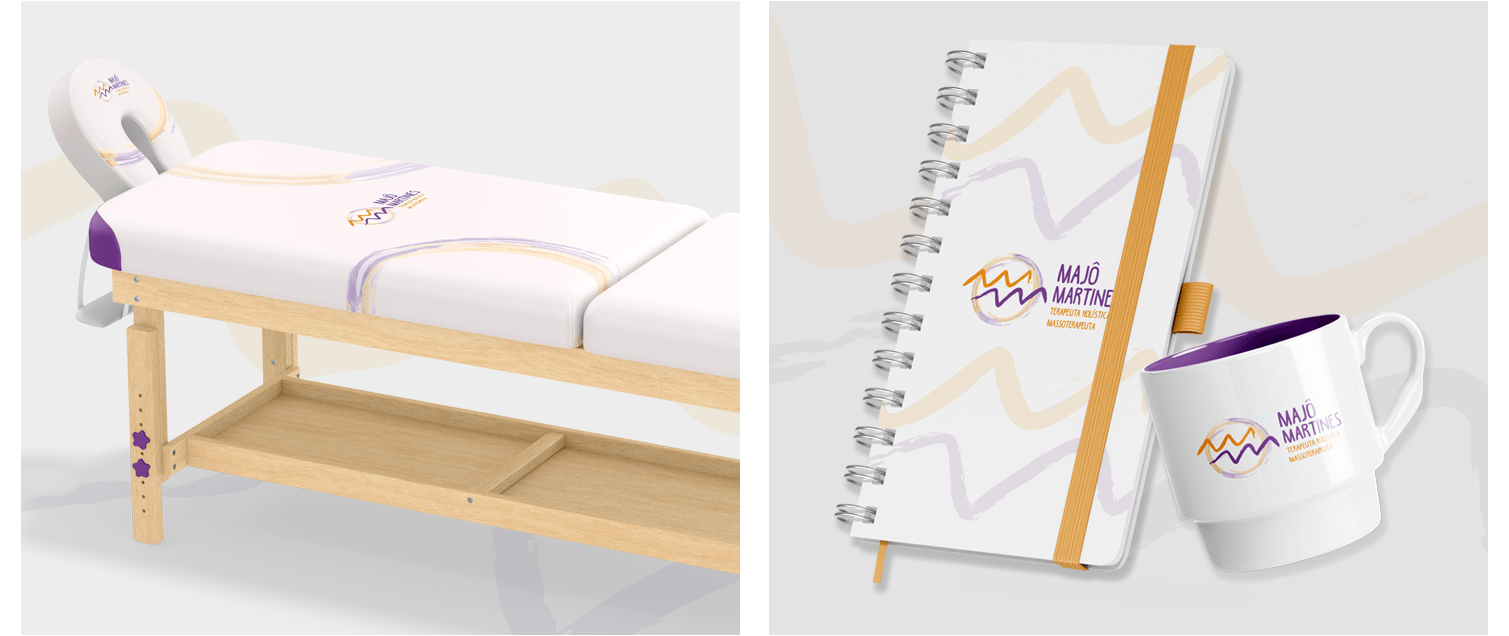 A premissa do logo foi estilizar o símbolo do signo de aquário – exigência da cliente – de modo que o transformasse nas iniciais da terapeuta. O estilo aquarelado do logo serviu para atribuir leveza, calma e tranquilidade, essenciais no tipo de serviço oferecido pela Majo.